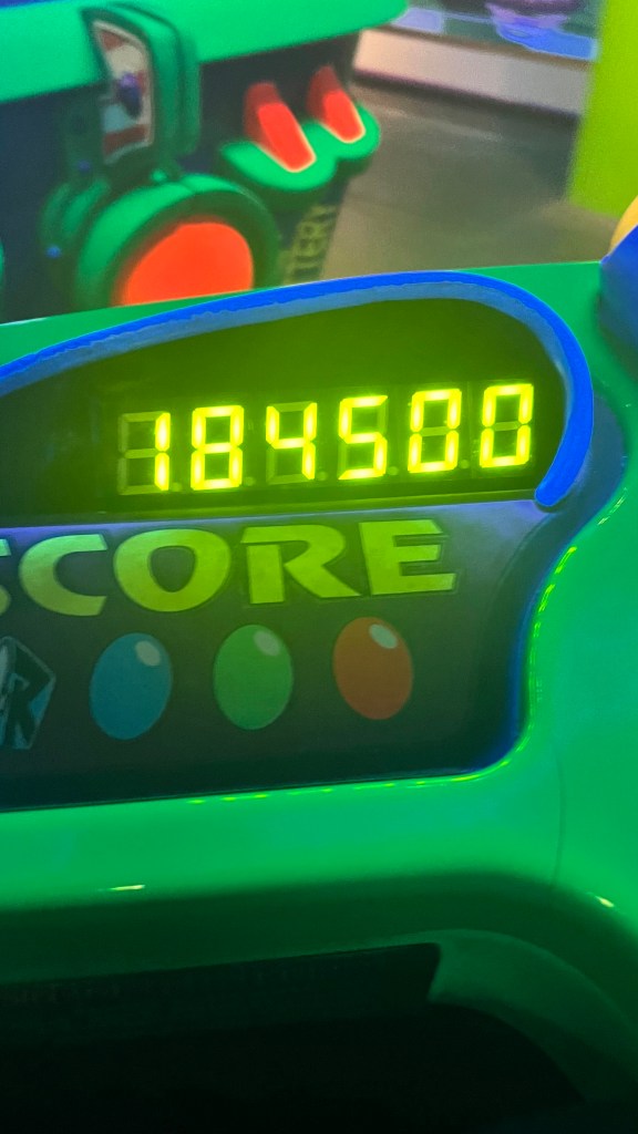 So for us, next up, Buzz Lightyear Laser Blast! This is a fun shooting game ride. I never get a good score and very rarely remember where the photo is on it either!!
