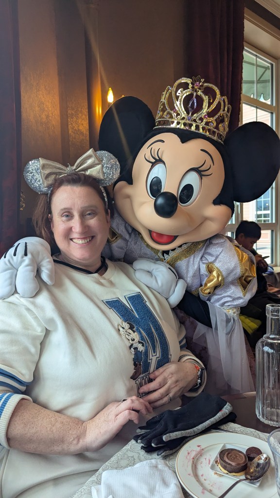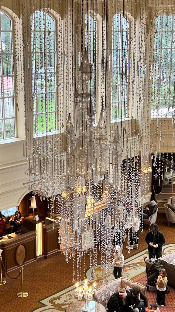 Disneyland Hotel is the ONLY 5* hotel at any Disney resort in the world. It just finished being refurbished in 2024 and is really stunning. We didn’t really go past the huge foyer where you’ll find the beautiful fireplace, and the castle chandelier. We sat here for a while to warm up and wait for our reservation time to come around.