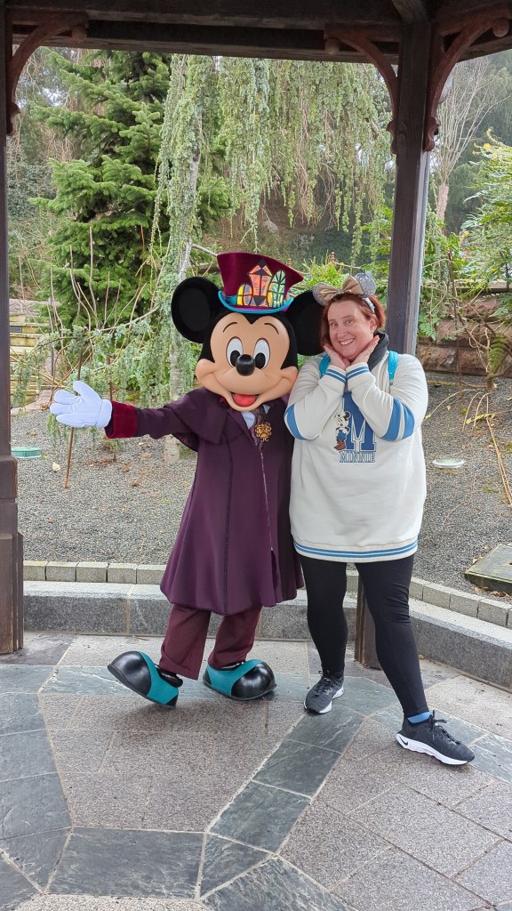 Our next ride was Phantom Manor and as we were walking to the ride we spotted that Mickey in his Phantom Manor outfit was there with no queue! So of course we jumped in and got our pictures with him!