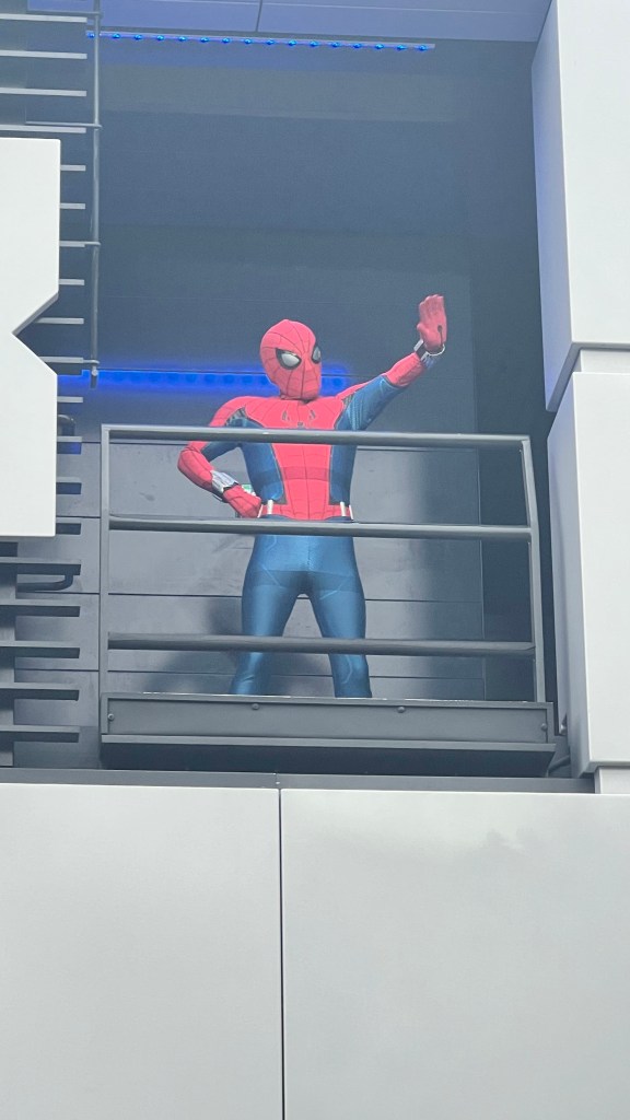 In Avengers Campus, the Marvel characters don’t have set times for their appearances, but you can usually tell when they are about to appear as they are heralded by some pretty loud theme music.